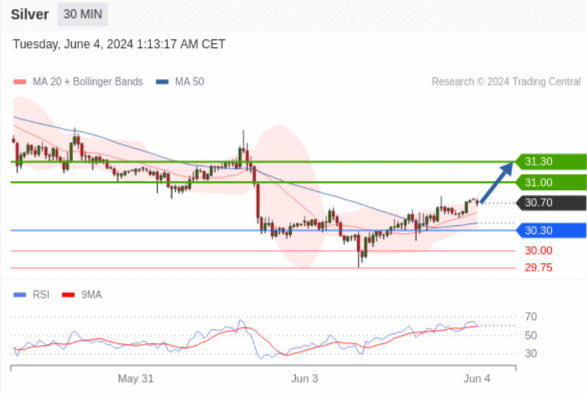 在 30.30 之上,看涨,目标价位为 31.00 ,然后为 31.30 。