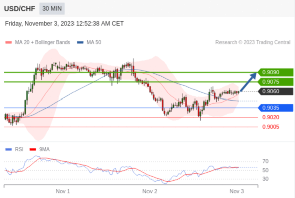 在 0.9035 之上,看涨,目标价位为 0.9075 ,然后为 0.9090 。