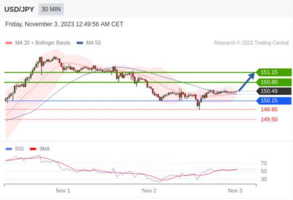 在 150.15 之上,看涨,目标价位为 150.80 ,然后为 151.15 。