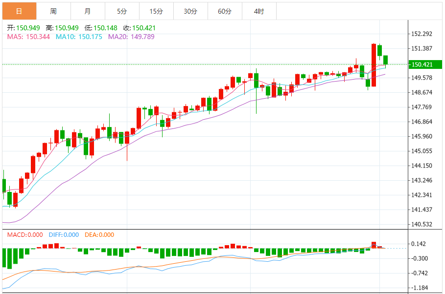 周四(11月2日),美元/日元下跌,暂报150.431,跌幅0.36%。