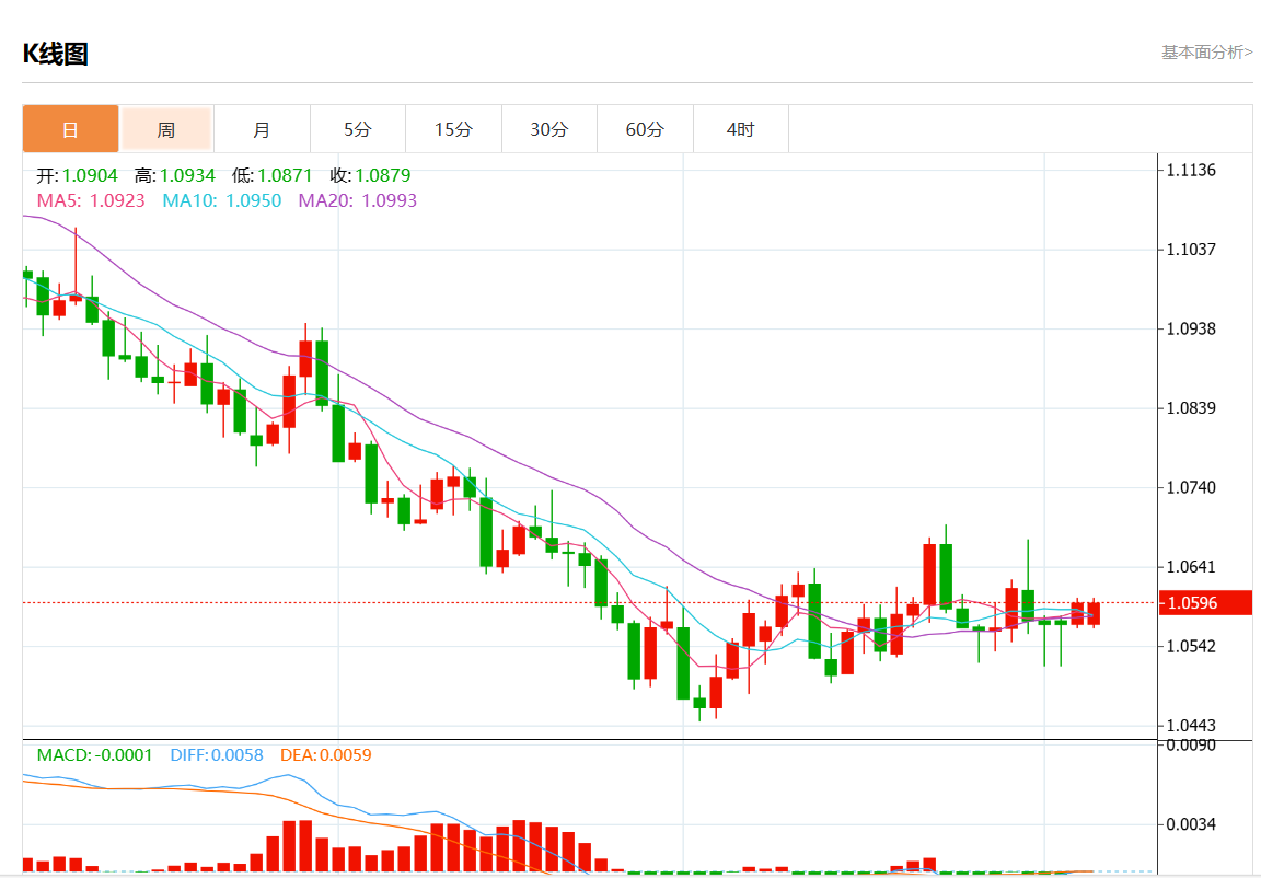 周四欧市盘中,欧元/美元最新报1.0596,日图涨0.25%.