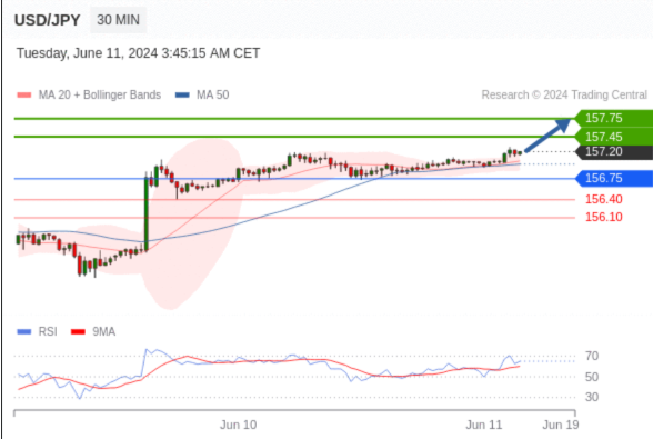 在 156.75 之上,看涨,目标价位为 157.45 ,然后为 157.75 。