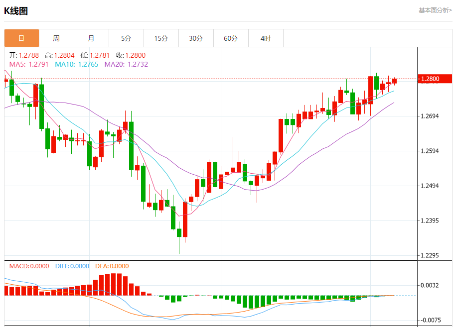 汇价高见1.2804,低见1.2781。上一交易日,汇价收于1.2790。