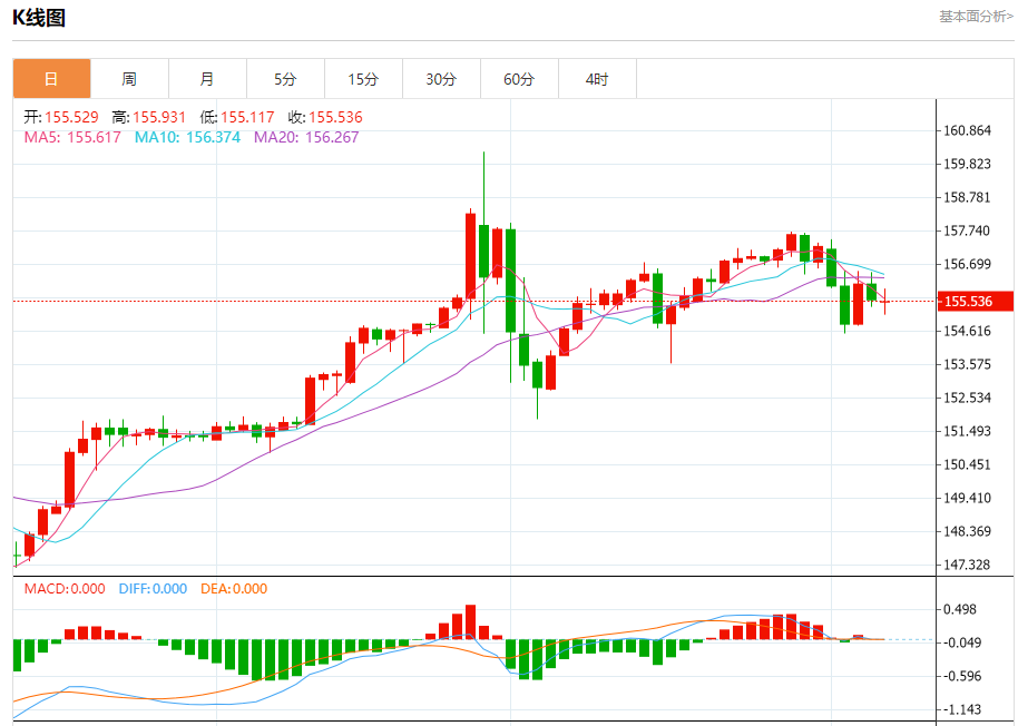 汇价高见155.931,低见155.117。上一交易日,汇价收于155.599。