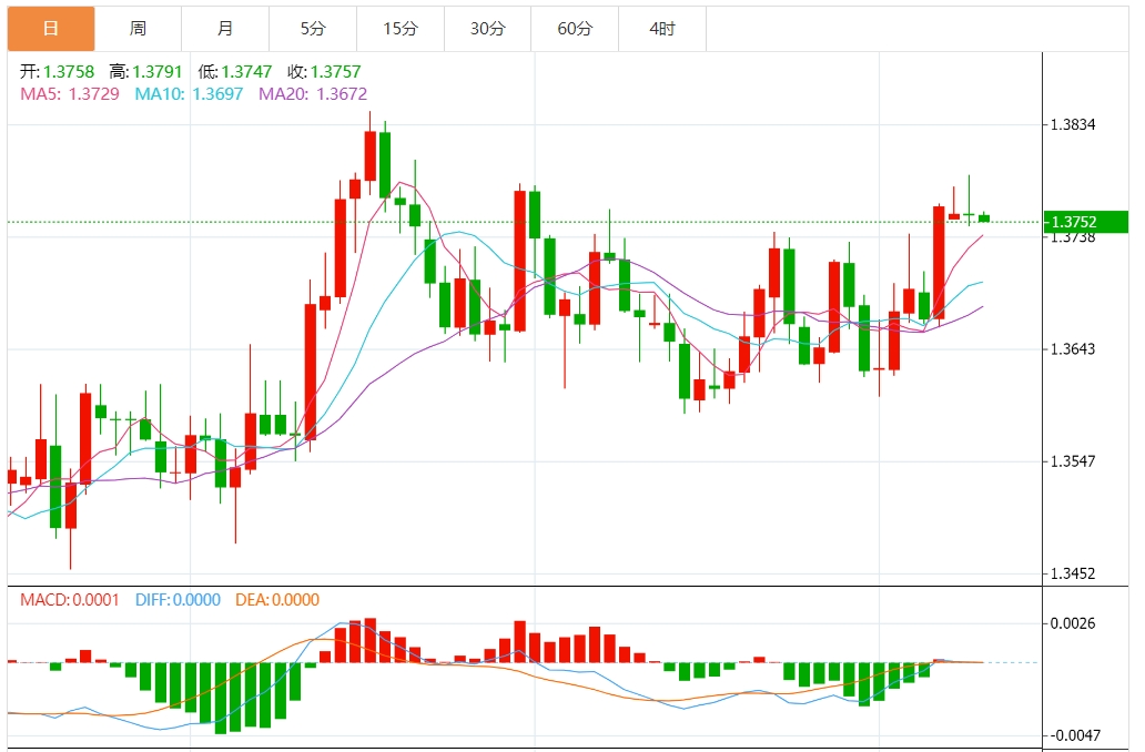 美元/加元在突破日线形成的下降三角形图表型态后走强。 向上倾斜的20天指数移动平均线(EMA)位于1.3700附近,显示近期走势看涨。