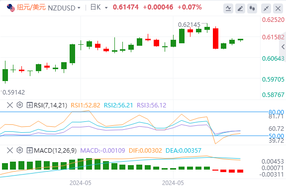 RSI技术指标大于中性区域50。MACD技术指标处在其信号线之下看多。此外,价位处在其20天及50天移动平均线上方(当前是0.6143和0.6132)。