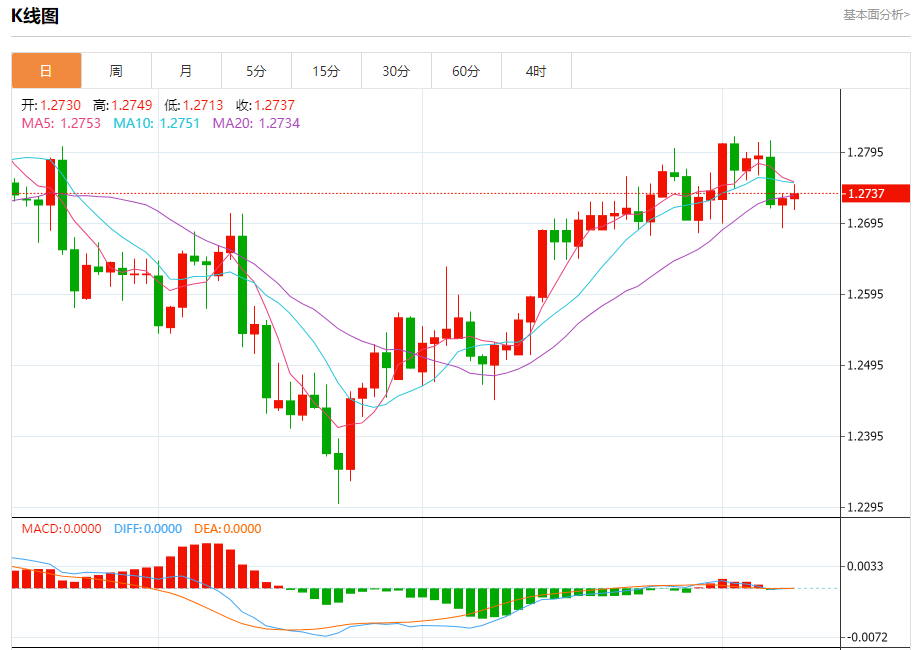 汇价高见1.2749,低见1.2713。上一交易日,汇价收于1.2730。