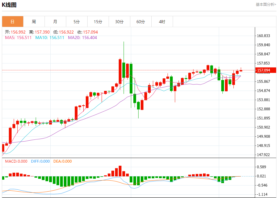 汇价高见157.390,低见156.922。上一交易日,汇价收于156.980。