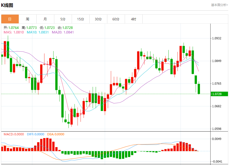汇价高见1.0773,低见1.0723。上一交易日,汇价收于1.0764。