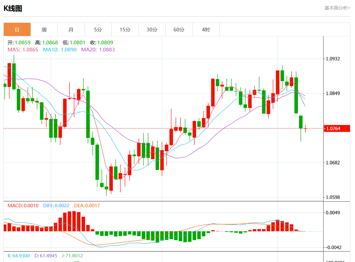 周二欧市盘中,欧元/美元最新报1.0765,日图涨0.01%。