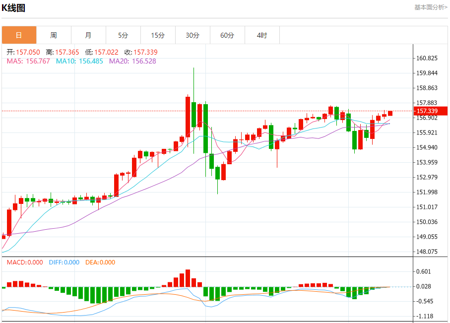 汇价高见157.365,低见157.022。上一交易日,汇价收于157.074。