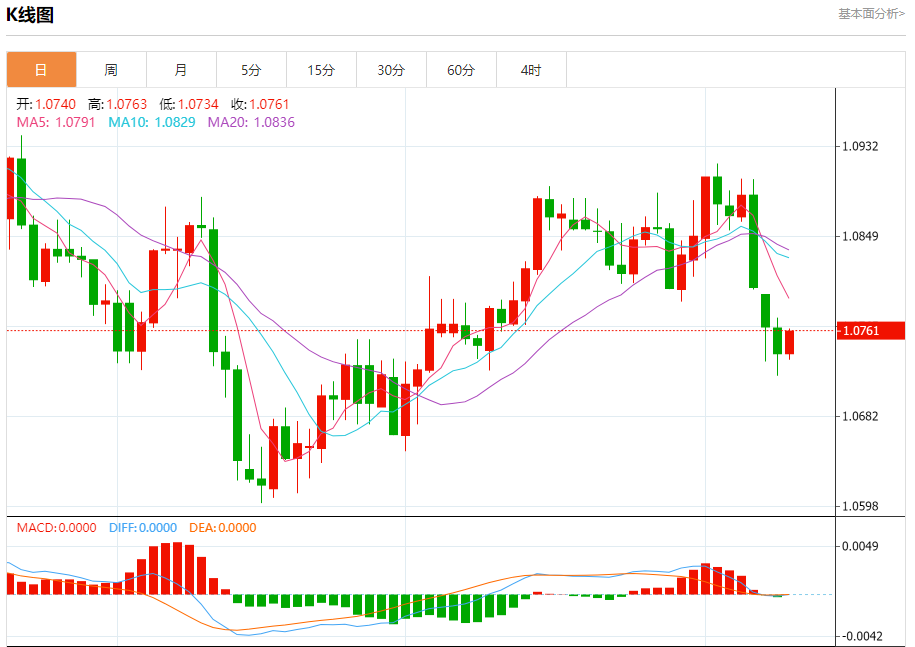 汇价高见1.0763,低见1.0734。上一交易日,汇价收于1.0739。