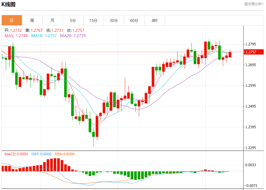 汇价高见1.2767,低见1.2731。上一交易日,汇价收于1.2738。