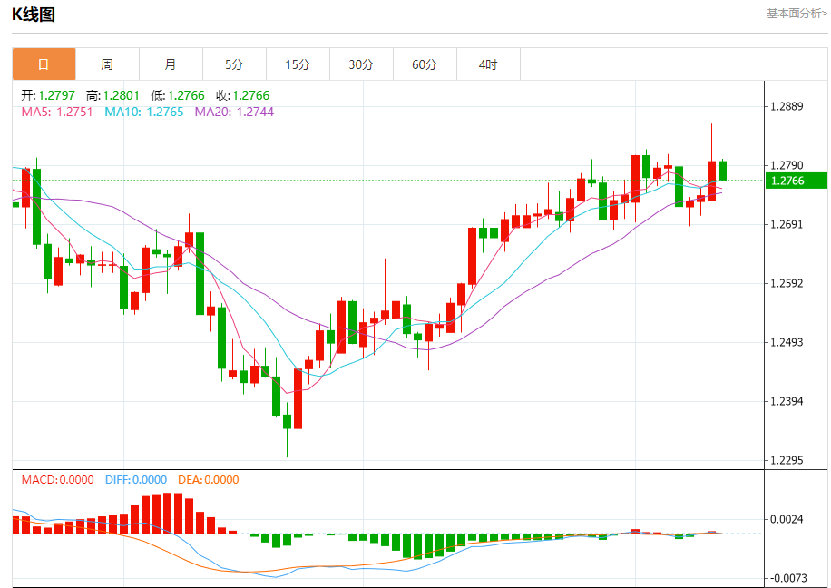 汇价高见1.2801,低见1.2767。上一交易日,汇价收于1.2797。