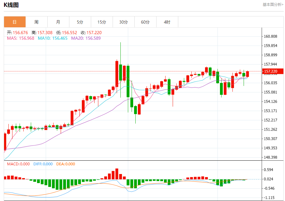 汇价高见157.308,低见156.552。上一交易日,汇价收于156.714。