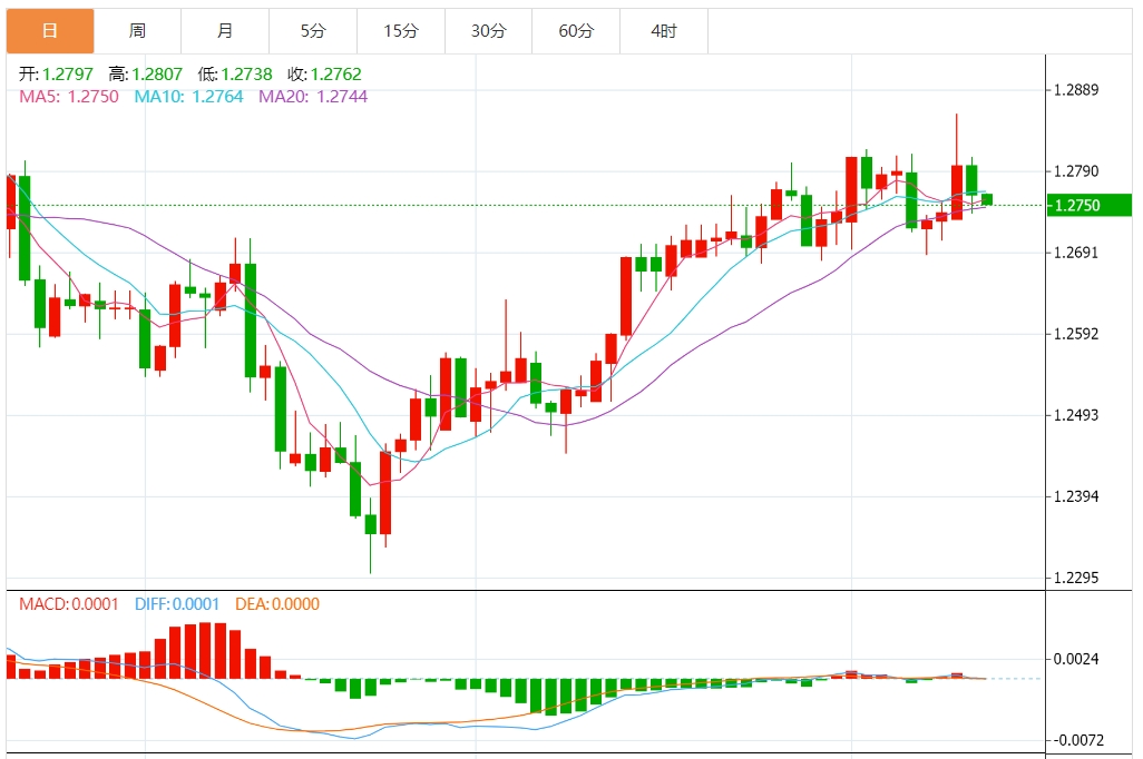 英镑兑美元跌至1.2740附近的两天低点。英镑/美元面临抛售压力,同时试图建立78.6%斐波那契回撤支撑位(从3月8日高点1.2900到4月22日低点1.2300)1.2770。