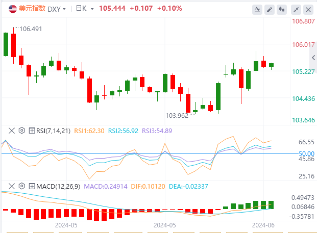 美联储鹰派言论给美元提供支撑。费城联储主席哈克周一表示,根据他目前的预测,他认为今年降息一次是合适的。这强调了利率可能会维持在高位的信号。此前上周末,明尼阿波利斯联储主席卡什卡利表示,美联储将等到12月再降息。
