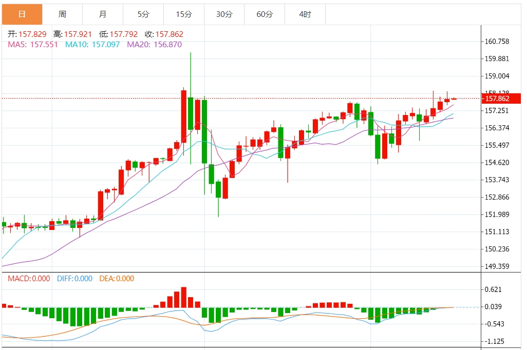 美元/日元在50天和200天EMA上方徘徊,证实了看涨价格信号。美元/日元升至159水平,可能预示着其将攀升至4月29日高点160.209。
