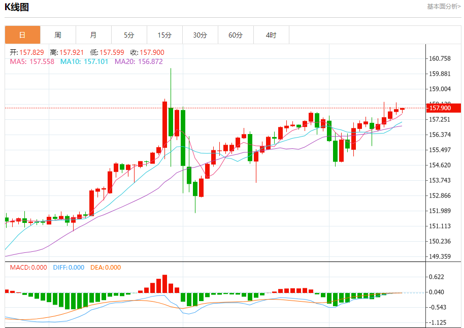 汇价高见157.921,低见157.599。上一交易日,汇价收于157.819。
