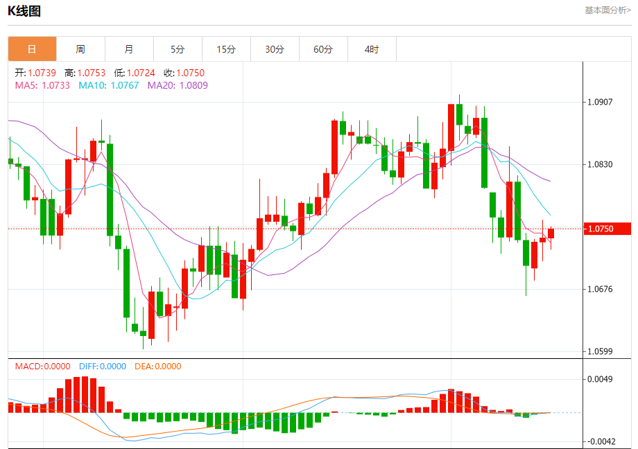 汇价高见1.0753,低见1.0724。上一交易日,汇价收于1.0739。