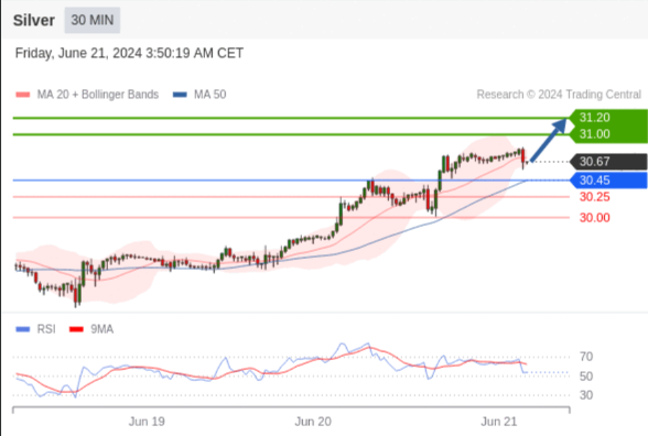 在 30.45 之上,看涨,目标价位为 31.00 ,然后为 31.20 。