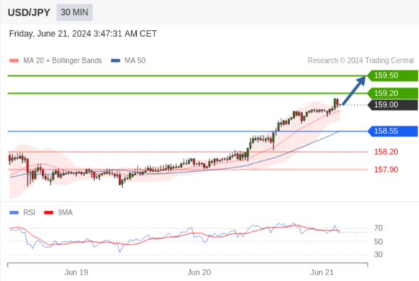 在 158.55 之上,看涨,目标价位为 159.20 ,然后为 159.50 。