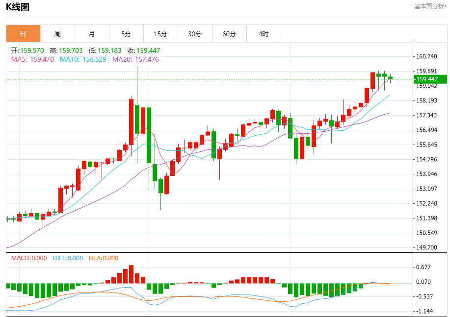 汇价高见159.691,低见159.179。上一交易日,汇价收于159.519。