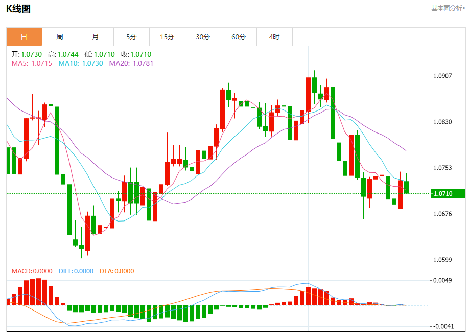 汇价高见1.0743,低见1.0711。上一交易日,汇价收于1.0732。