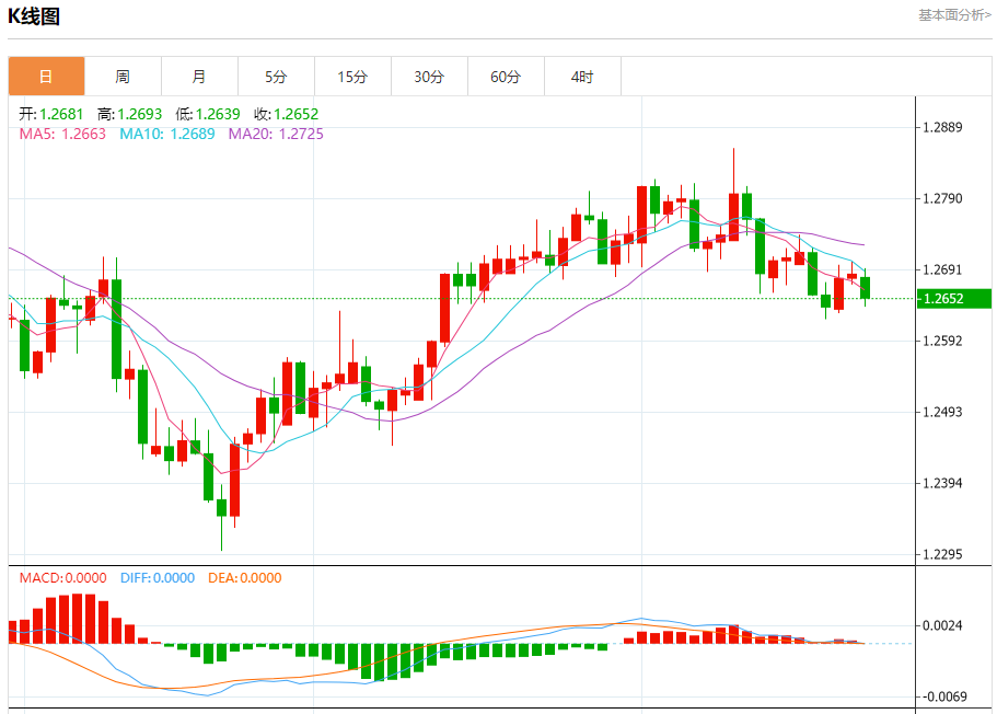 汇价高见1.2692,低见1.2639。上一交易日,汇价收于1.2685。