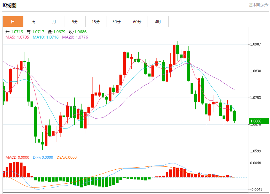 汇价高见1.0717,低见1.0679。上一交易日,汇价收于1.0713。