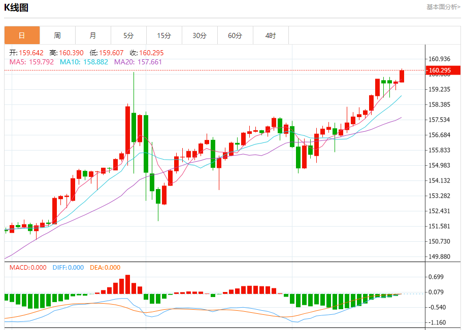 汇价高见160.381,低见159.578。上一交易日,汇价收于159.640。