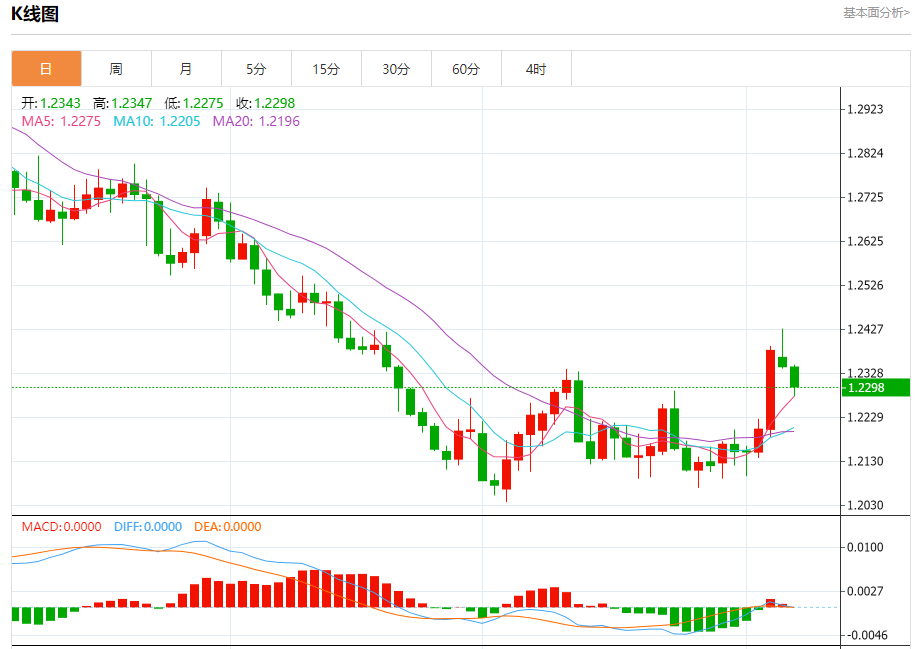 汇价高见1.2347,低见1.2275。上一交易日,汇价收于1.2343。