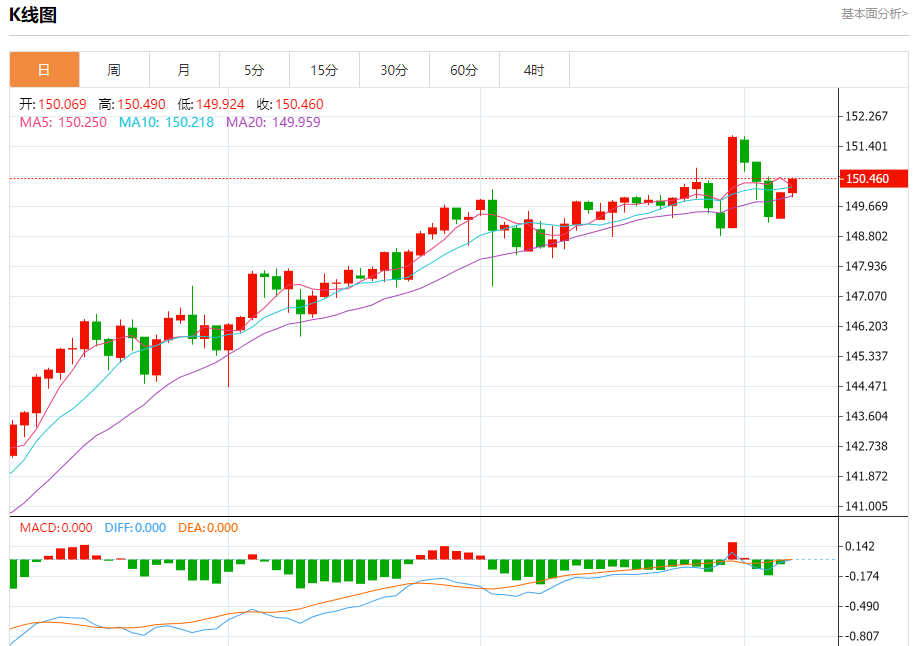 汇价高见150.490,低见149.924。上一交易日,汇价收于150.067。