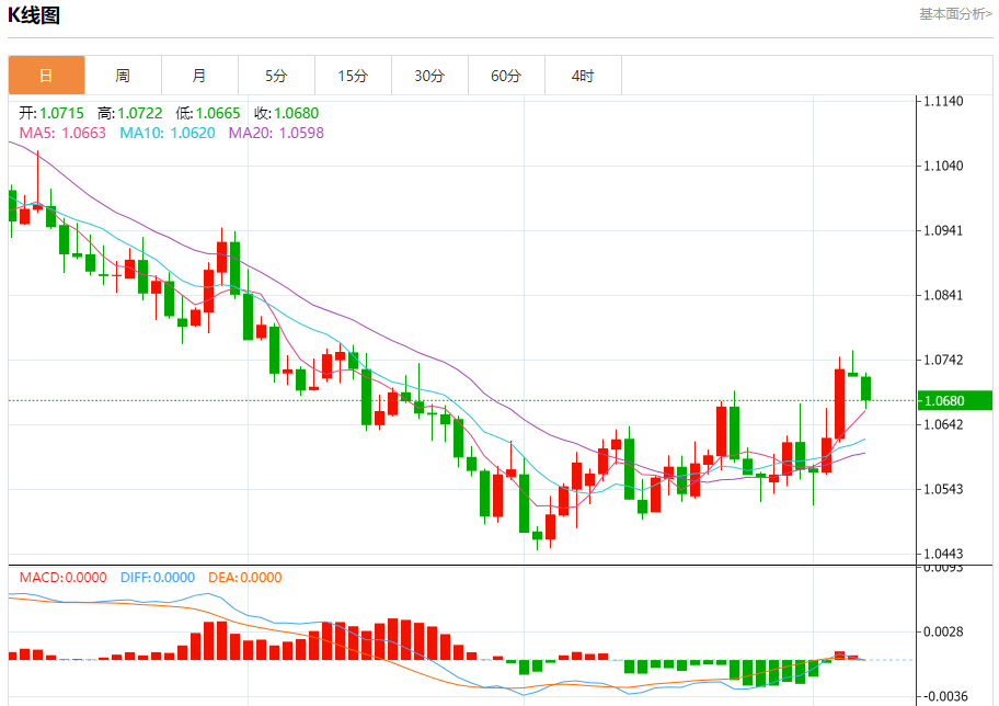 汇价高见1.0722,低见1.0665。上一交易日,汇价收于1.0717。