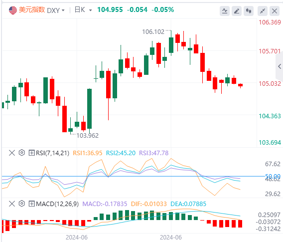 追踪美元兑六种主要货币的美元指数周三下跌0.12%,至105.00。