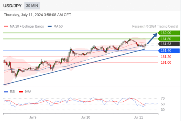 在 161.40 之上,看涨,目标价位为 161.80 ,然后为 162.00 。