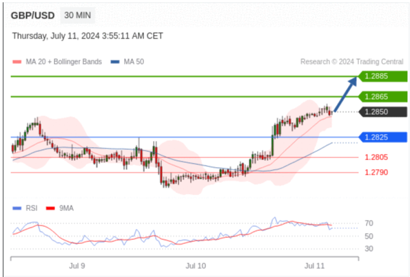 在 1.2825 之上,看涨,目标价位为 1.2865 ,然后为 1.2885 。