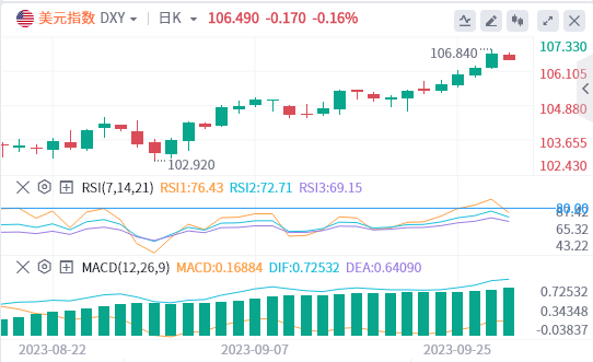 因投资者看好美国经济表现在高利率的环境下优于其他国家,美元指数周三续创去年11月以来最高。美国10年期国债收益率周三持续攀升,一度触及4.613%,为2007年10月以来最高水平,为美元带来强劲买盘。
