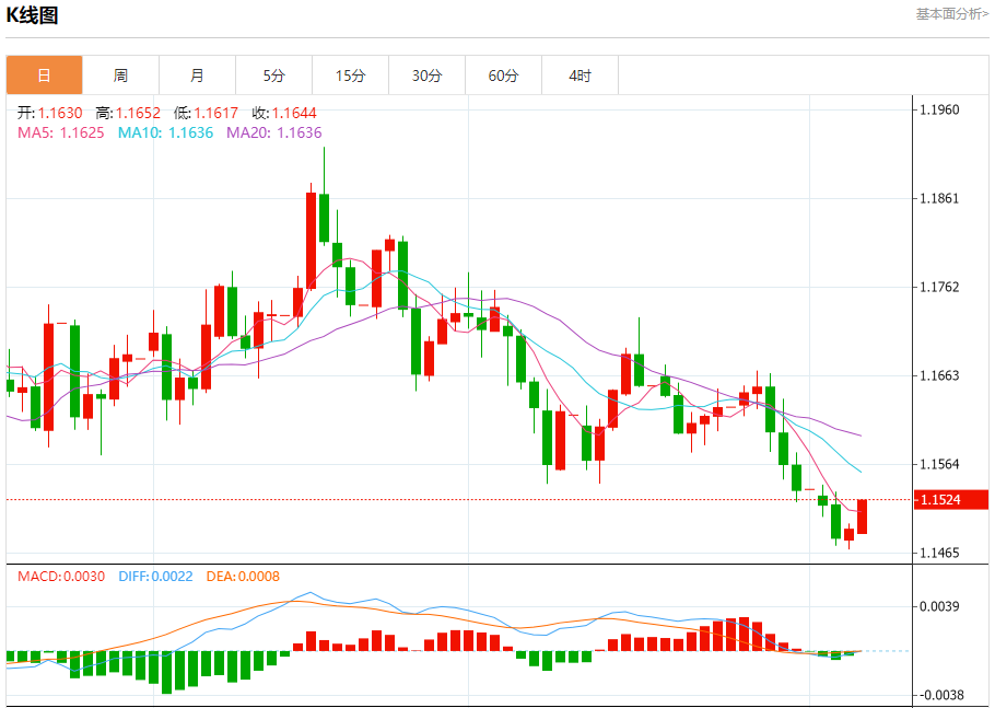 汇价高见1.1525,低见1.1486。上一交易日,汇价收于1.1492。