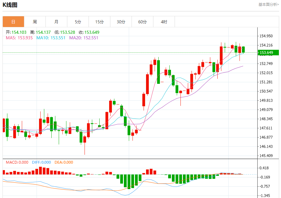 汇价高见154.137,低见153.528。上一交易日,汇价收于154.102。