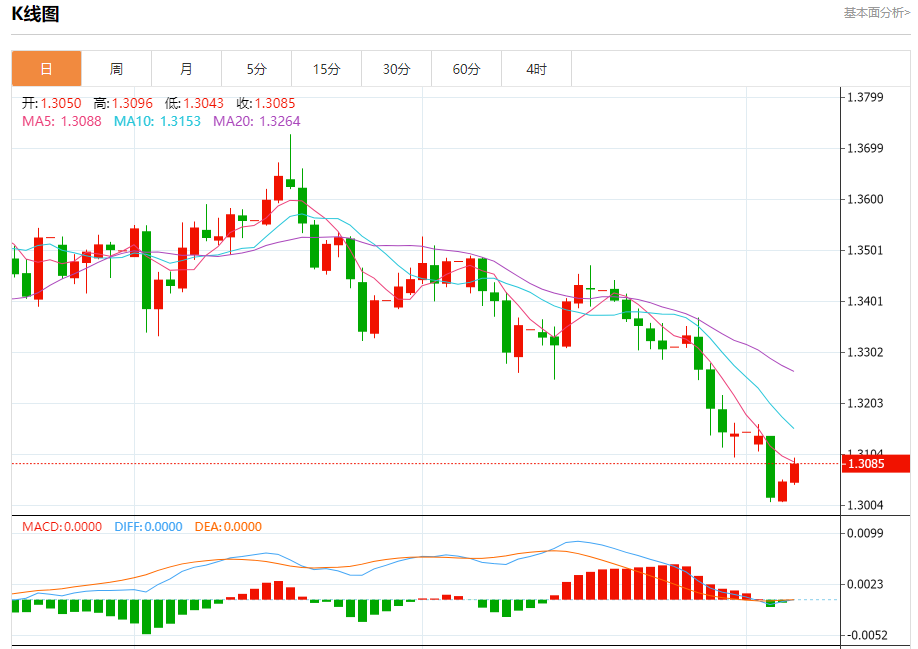汇价高见1.3096,低见1.3043。上一交易日,汇价收于1.3050。