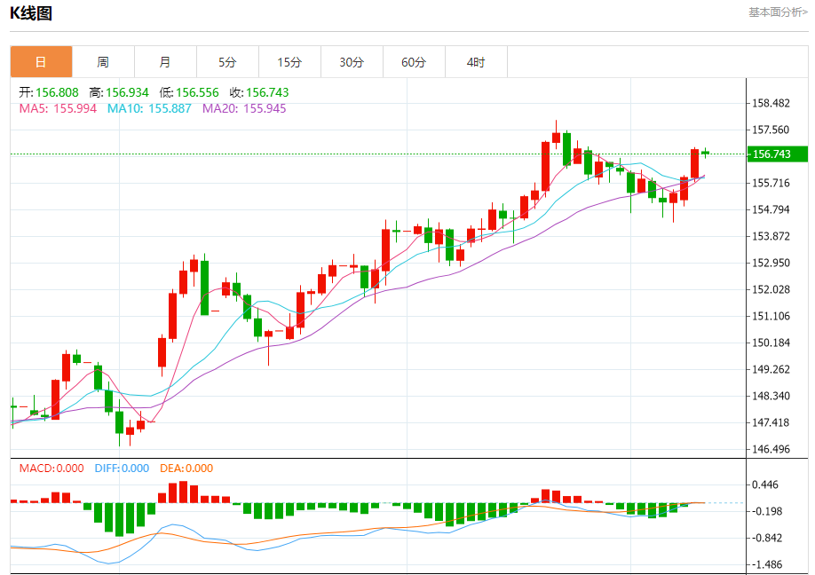 汇价高见156.925,低见156.546。上一交易日,汇价收于156.881。