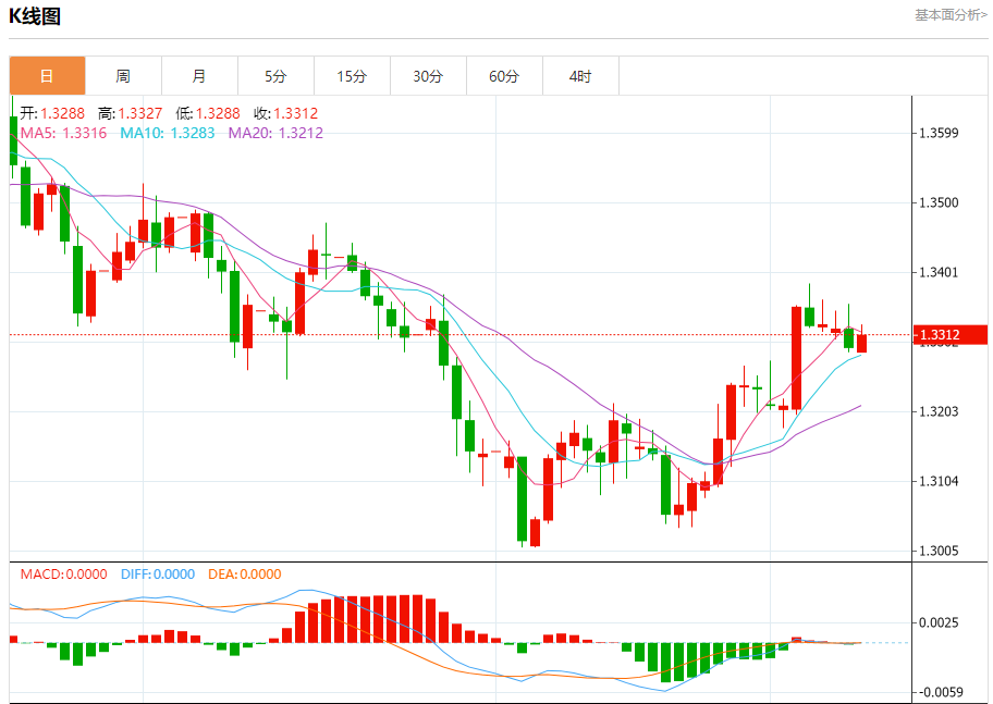 汇价高见1.3326,低见1.3292。上一交易日,汇价收于1.3295。