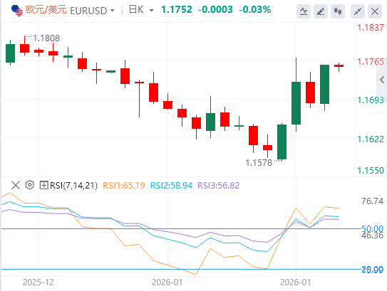 欧元/美元汇率高于九日指数移动平均线(EMA)和50日均线,保持短期正向偏向。两者均线均向上倾斜,9日均线高于50日均线,强化多头结构。趋势研究支持,50日均线上升,价格稳稳上方。九日均线继续上涨,限制浅回调。