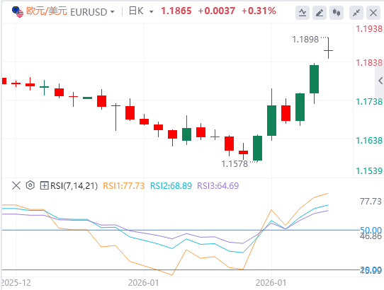 截至撰写时,欧元兑美元在约1.1866处上涨。价格维持在20日指数移动平均线(EMA)1.1713上方,保持短期看涨偏向。20日均线上行,确认趋势结构正在改善。